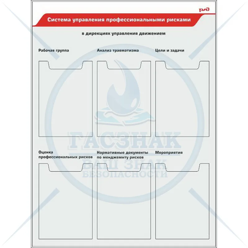 Стенды по охране труда для ОАО РЖД Охрана труда профиль Nielsen, 6 вертикальных карманов А4 (Пластик ПВХ 4 мм, алюминиевый профиль; 1000х1000)