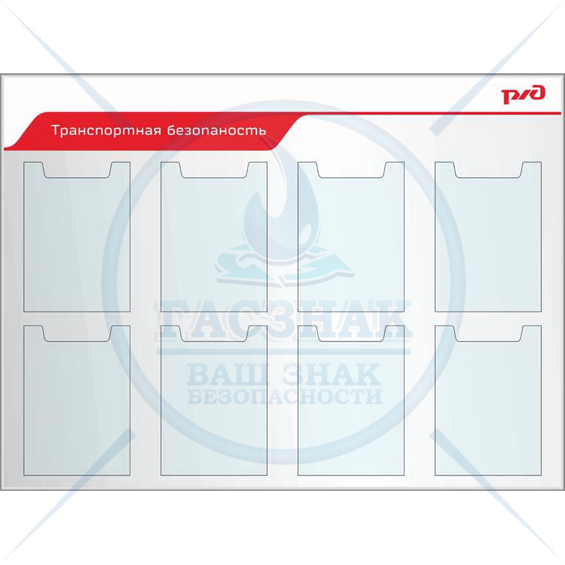 Стенд. Стенд Уголок по охране труда ( 4 кармана формата А4, плоских, 2 кармана формата А4, объемных) стиль РЖД с логотипом, Логотип (1000х1000; Пластик ПВХ 4 мм, алюминиевый профиль; )
