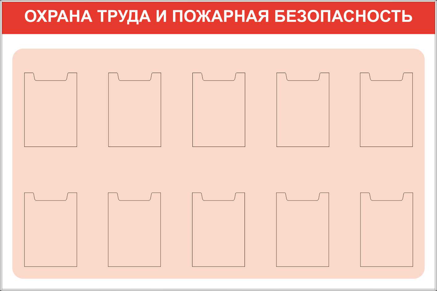 Стенд. Охрана труда и пожарная безопасность, на красной полосе, 1800х1200, 10 плоских вертикальных карманов А4 (; Пластик ПВХ 4 мм, пластиковый профиль; )
