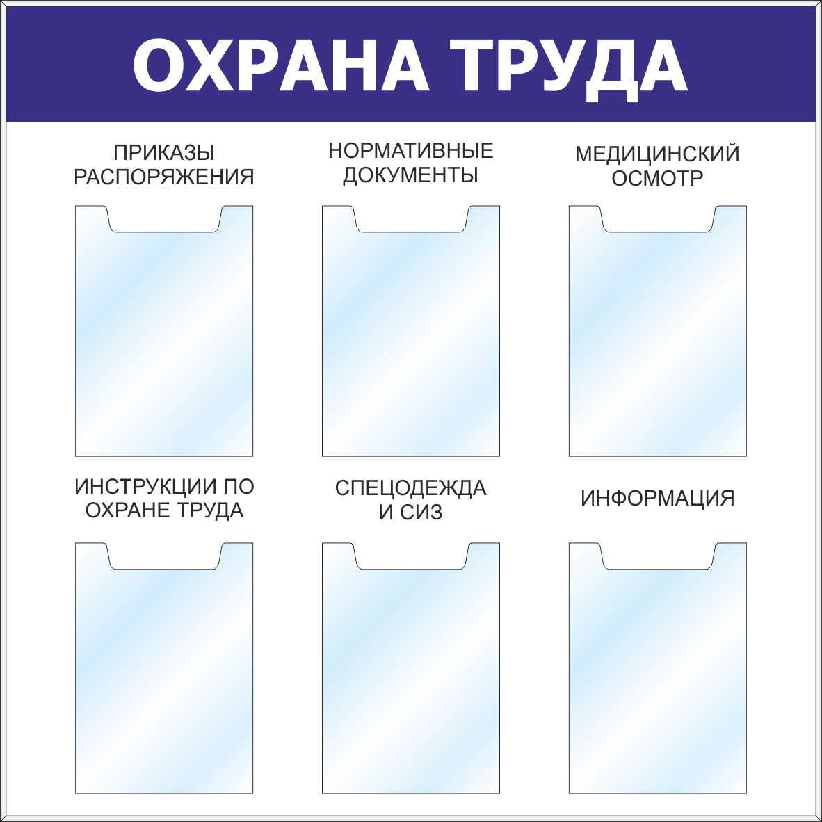 Стенд Охрана труда Наполнение: 6 карманов А4 (плоские), подписанные, Логотип (1000х1000; Пластик ПВХ 4 мм, алюминиевый профиль; )
