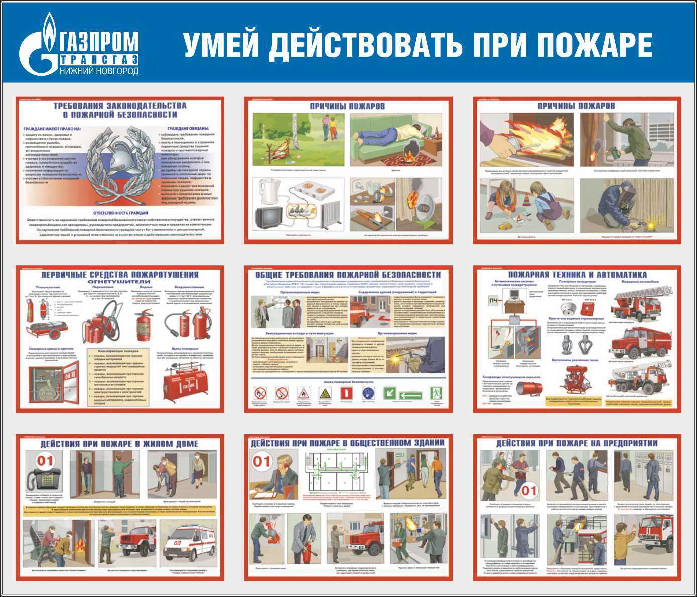 Стенд Умей действовать при пожаре. 9 плакатов А3, Логотип (1400х1200; Пластик ПВХ 4 мм, пластиковый профиль; Пластиковый)